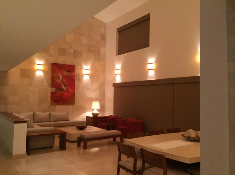 En planta baja cuenta con sala comedor a doble altura, cocina con desayunador, cuarto de lavado, recámara con baño completo y vestidor, y medio baño para visitas.